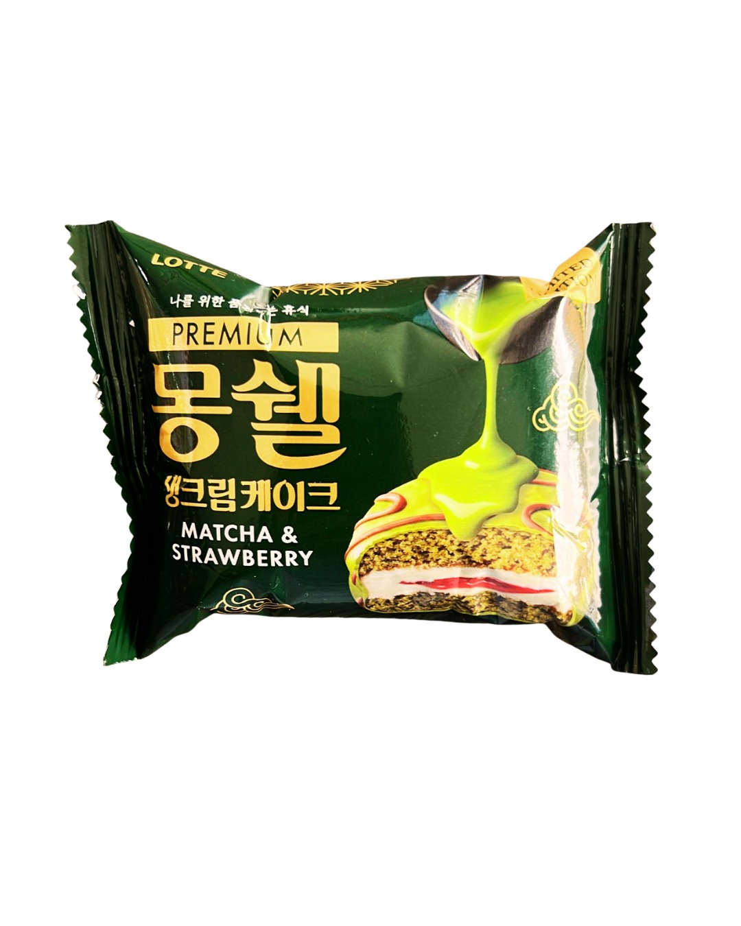 Pastelito esponjoso de té verde matcha, relleno de crema suave y una capa de mermelada de fresa, con cobertura de matcha por encima. Tiene un perfil más delicado y elegante, con contraste entre lo amargo del matcha y lo dulce-ácido de la fresa.